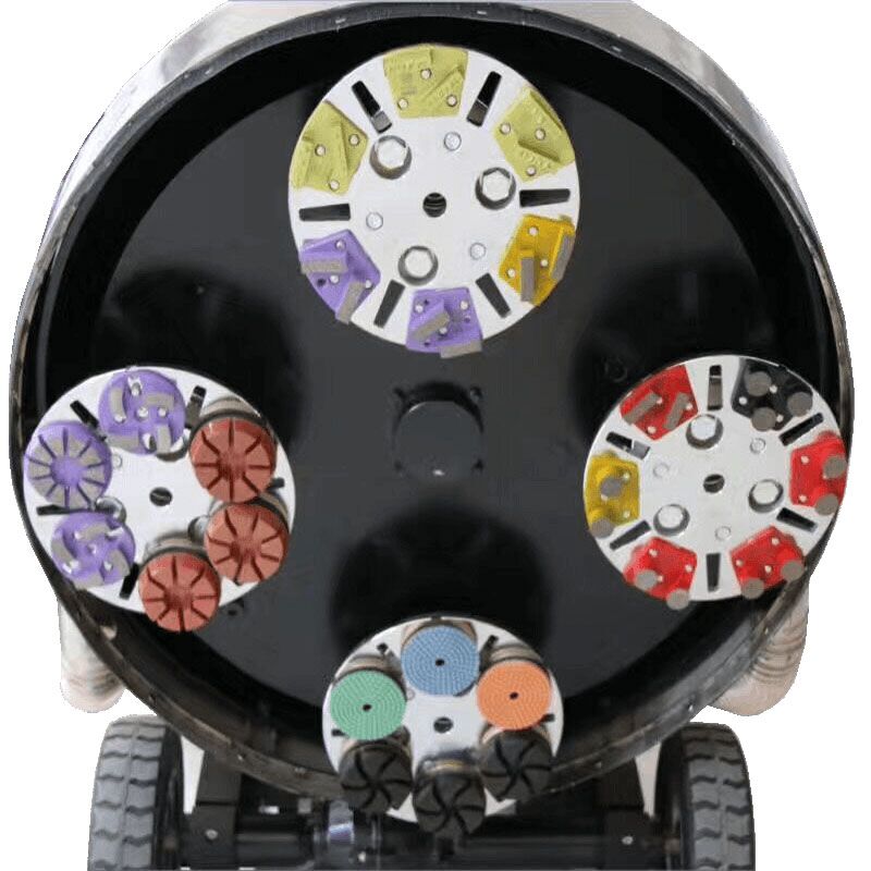 HW-G10, 10hp, grinding width 600mm, 4 grinding plates, 12 pieces of diamond tool. With the magnetic disk and Velcro, It is very easy and shift to change diamond tool. The design of square disc plate could 100% touch wall and grind corner.