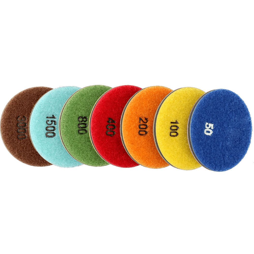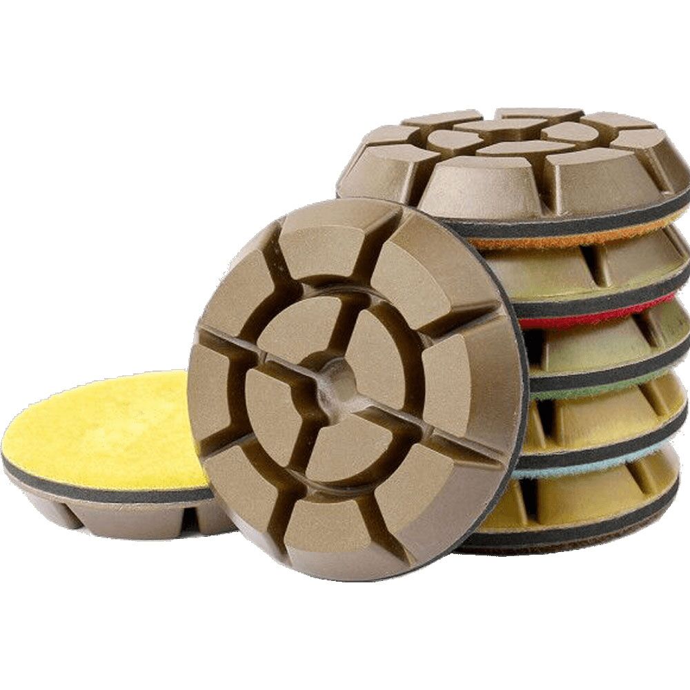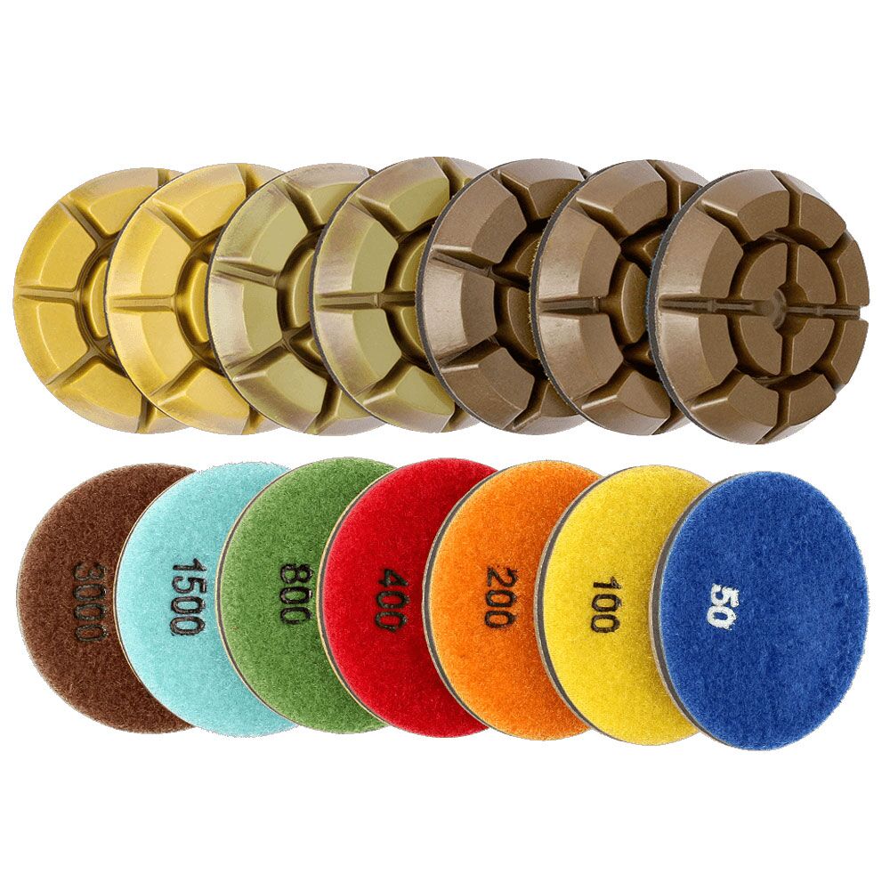 For polishing various curve surface of concrete and stone, using sequence: from rough grit to fine, finally polishing. The 50 grit eliminate the trowel marks, smooth rough area and expose light aggregate and it is also great for shaping edges and removing mold lines; The 100 grit will fellow and so on, until you achieve a satisfied polished shine;